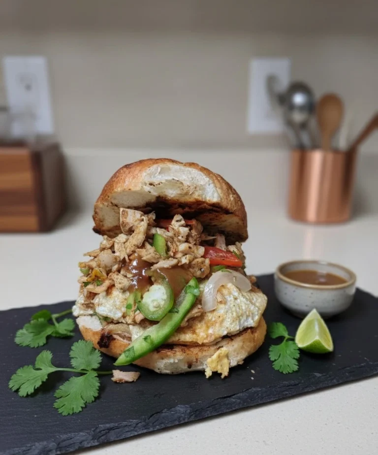 - Smash Beef (120g), Marinated Chicken , Pulled Chicken or Fried Egg Stacked with charred peppers and fresh